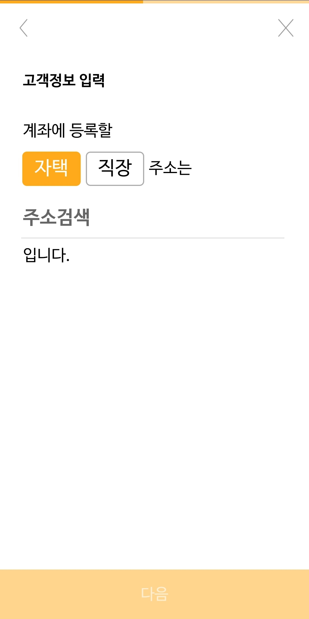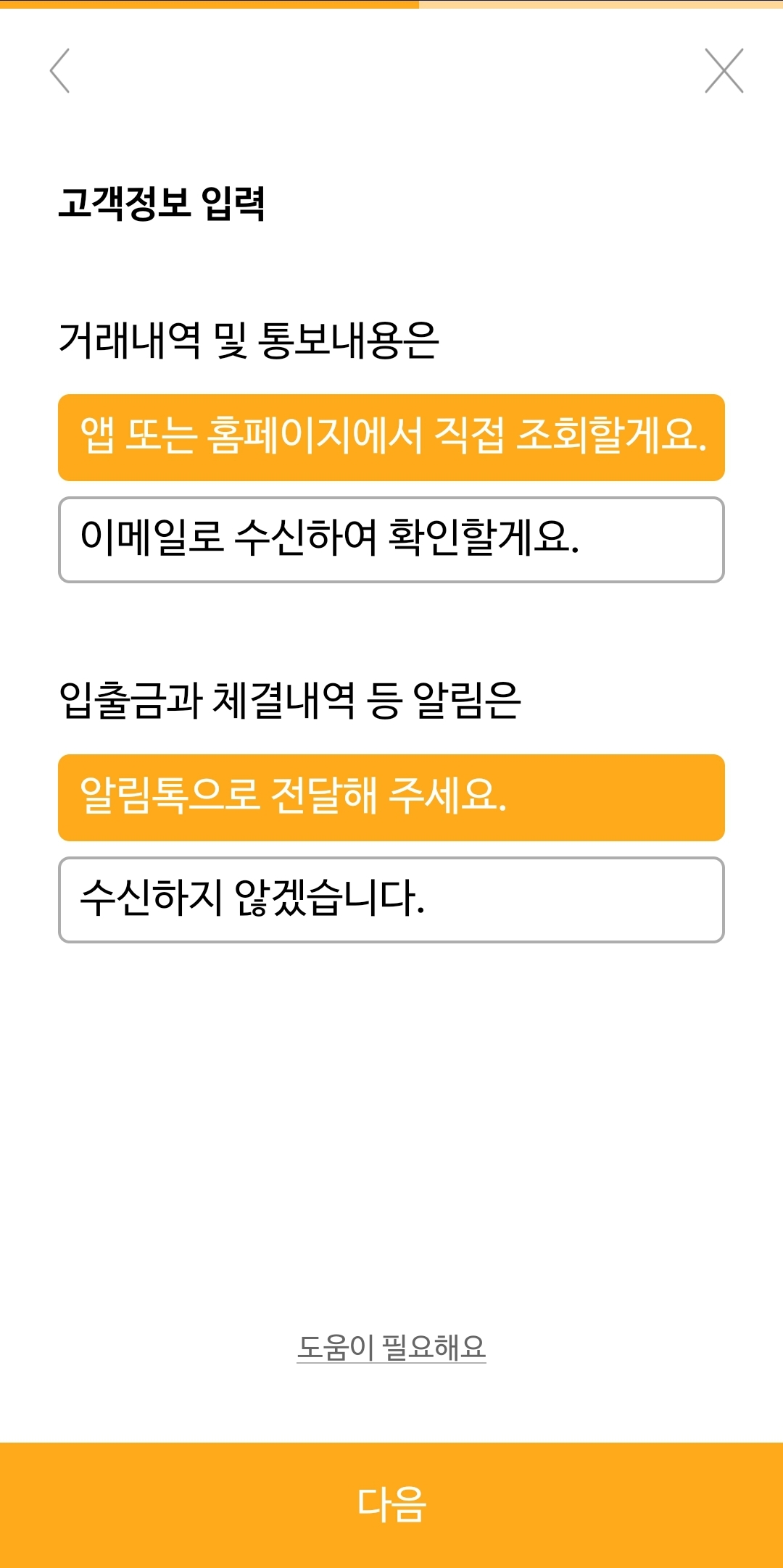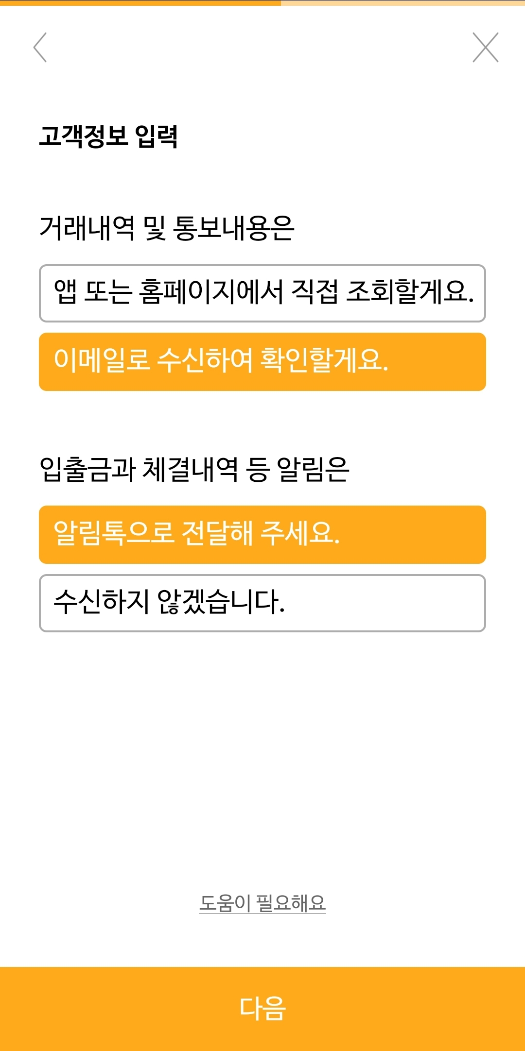 다음으로 고객정보를 입력하는 곳인데요. 자택이나 직장주소를 입력하고 다음으로 이메일주소, 그리고 거래내역 및 통보내용, 입출금과 체력내역 등 알림에 대한 방법을 선택합니다.