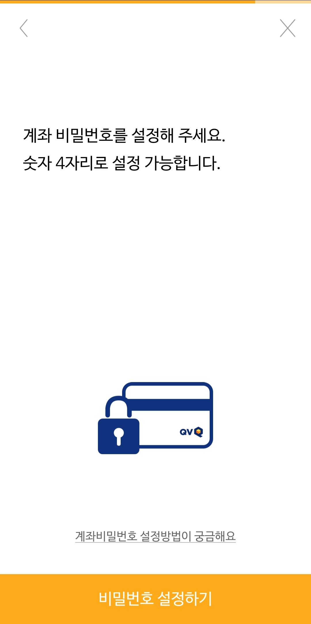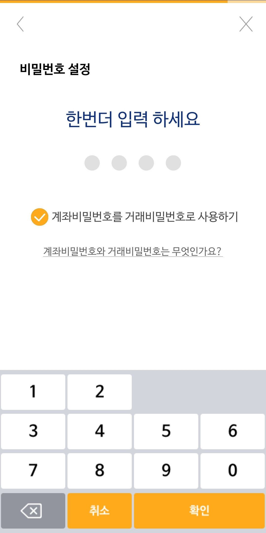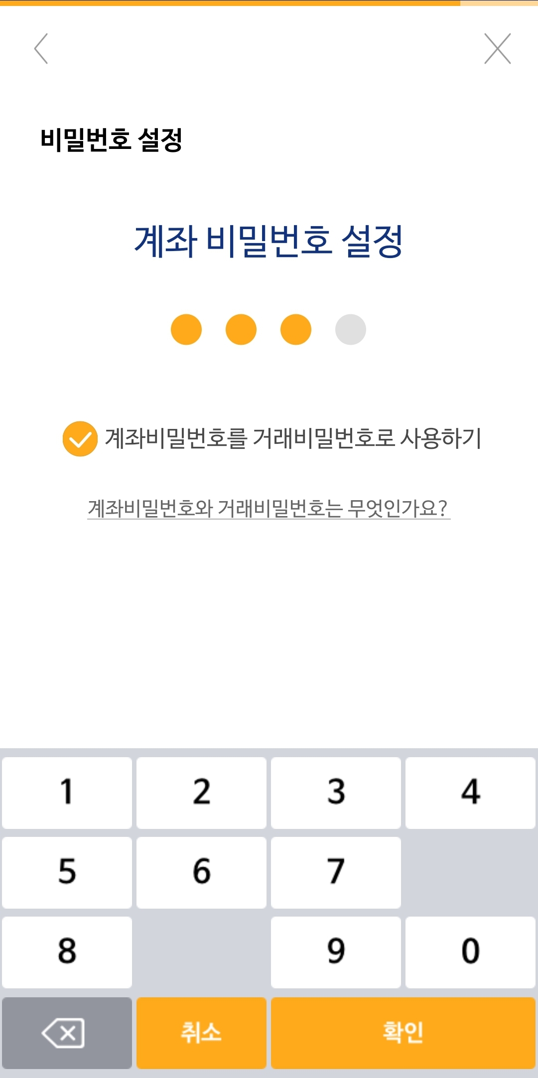 마지막 단계인 계좌비밀번호를 설정하는 단계입니다. 계좌비밀번호를 4자리로 보안에 유의해서 남들이 알지 못하게 비밀번호를 잘 설정해주시면 이제 모든 단계가 끝납니다.