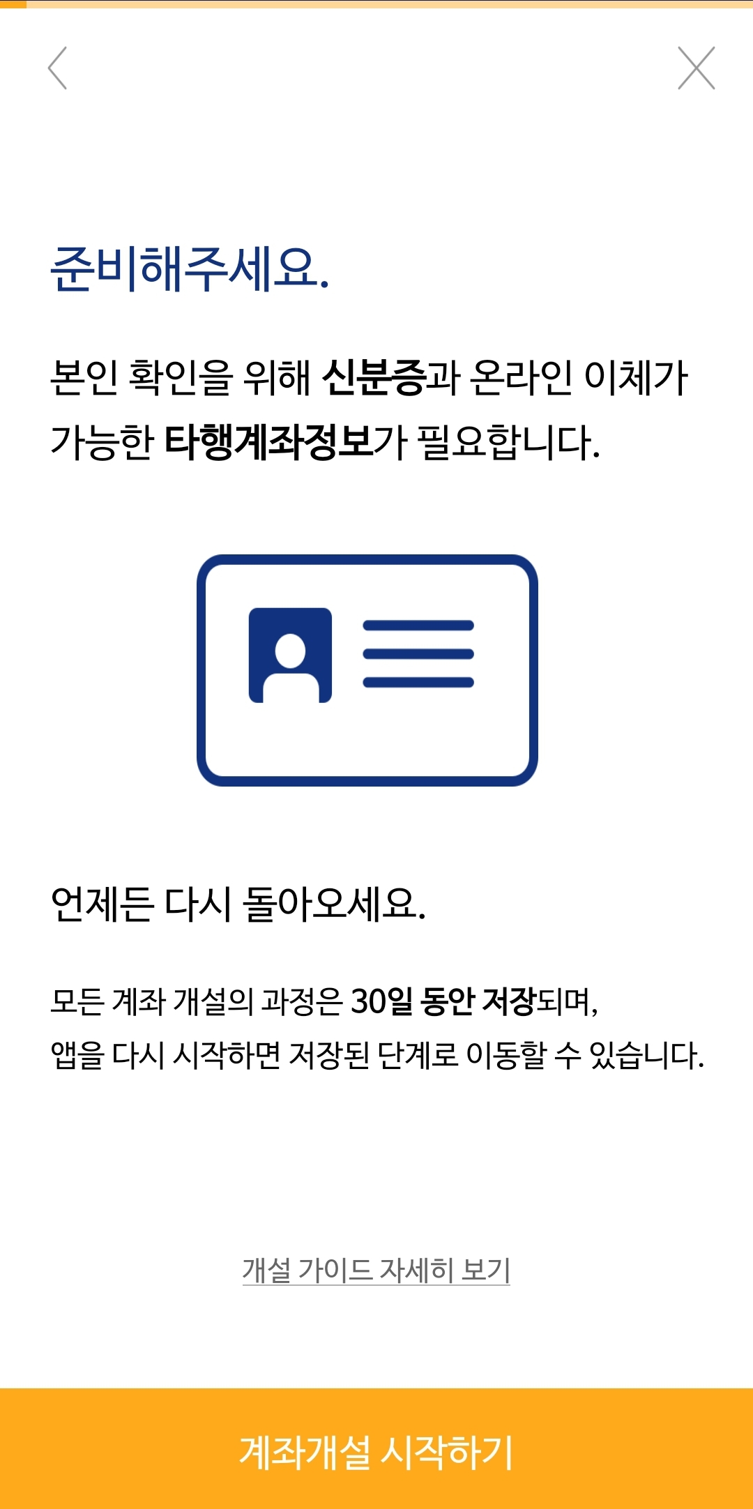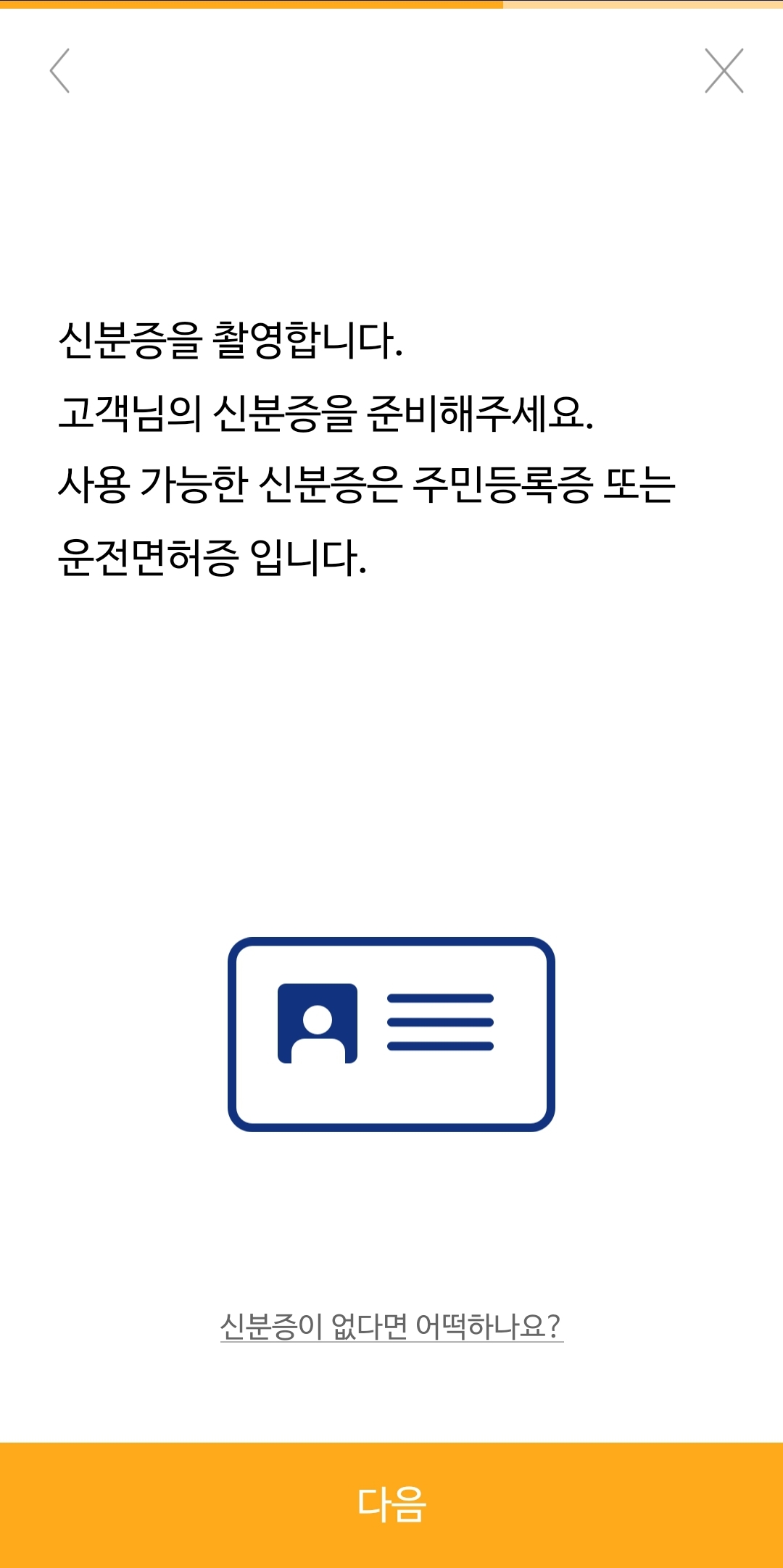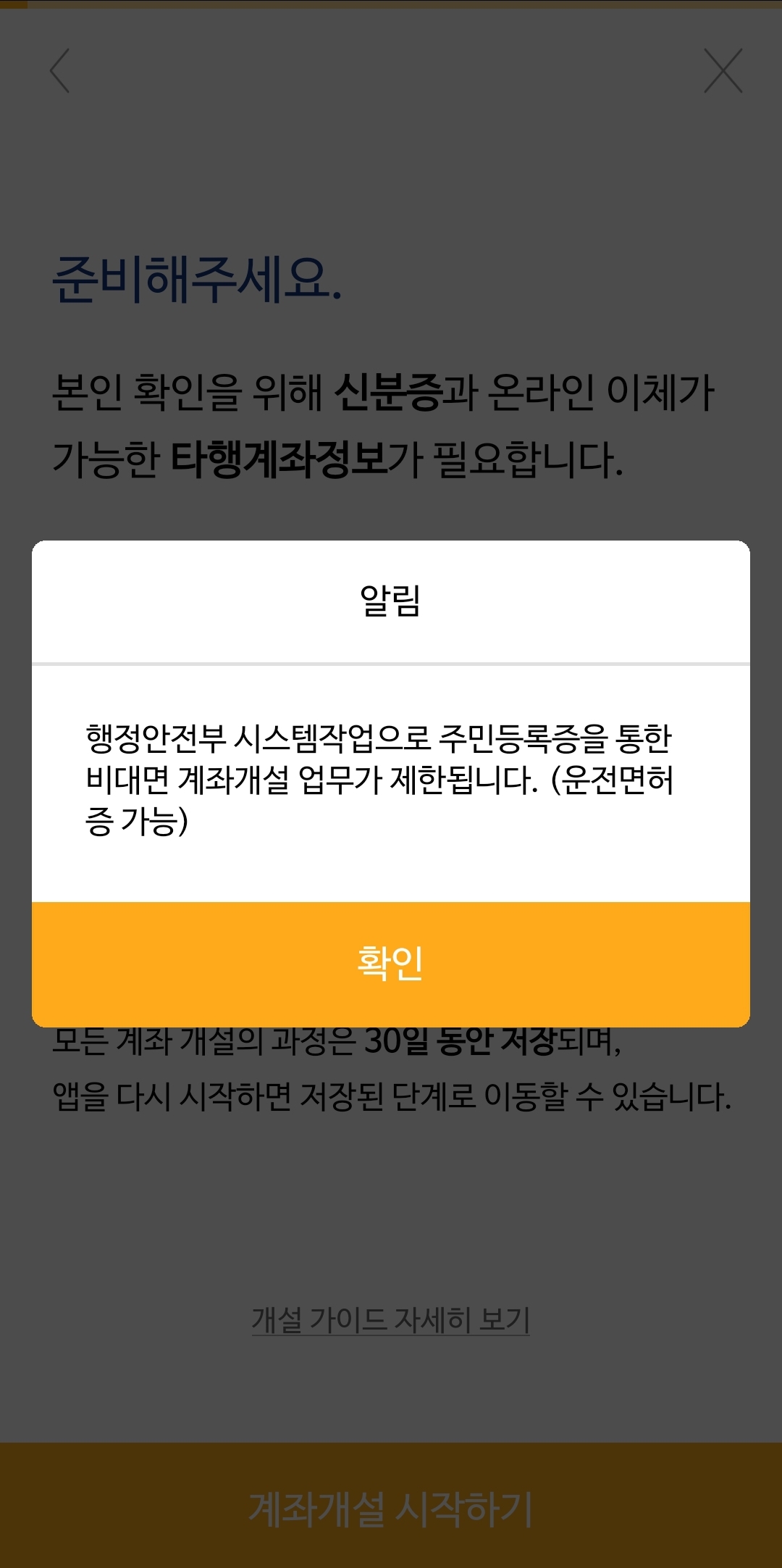 제가 신규계좌개설을 할 때는 행정안전부 시스템작업으로 주민등록증을 통한 비대면 계좌개설 업무가 제한되는 시간이었네요. 저는 운전면허증을 준비하였습니다.