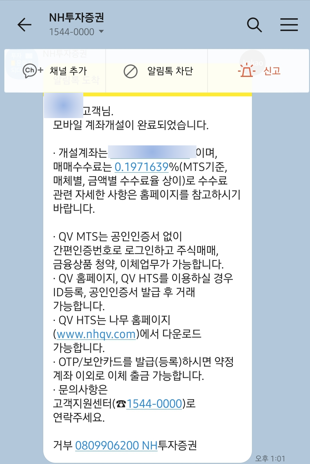 그럼 계좌번호는요? 카카오톡으로 가시면 NH투자증권에서 개설된 계좌번호와 매매수수료 등이 적힌 카카오톡이 도착되어있으니 개설하신 NH투자증권의 계좌번호 등을 확인하시면 됩니다.