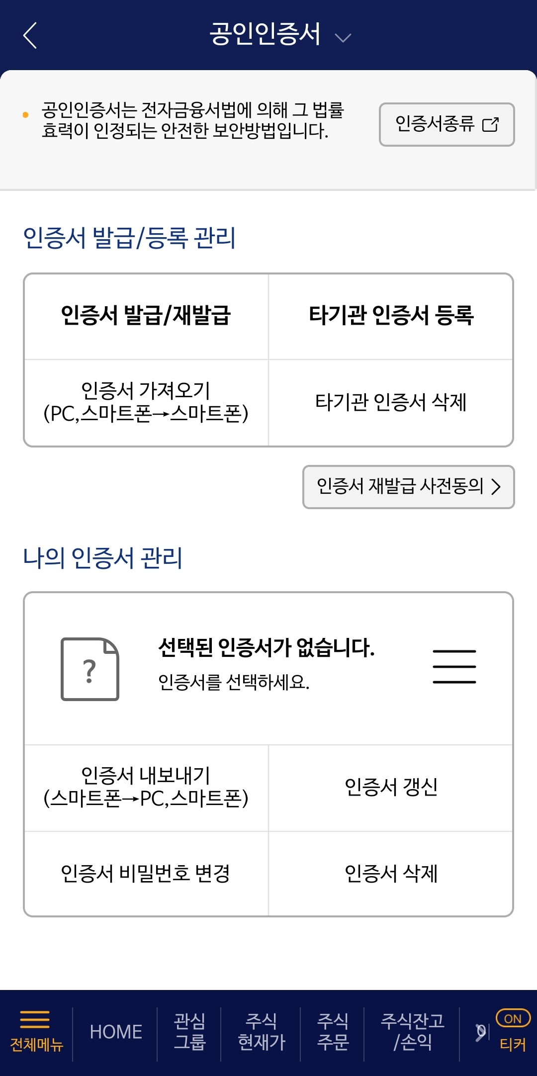 이제부터 NH투자증권 계좌를 개설하셨다는 가정하에 NH투자증권어플 QV에서 신규계좌개설후 타기관 공인인증서 등록하는 방법을 상세하게 알아보도록 하겠습니다. 먼저 계좌를 개설하시고 로그인을 하시면 당사에 등록된 공인인증서가 없다면서 등록을 하라고 나옵니다.