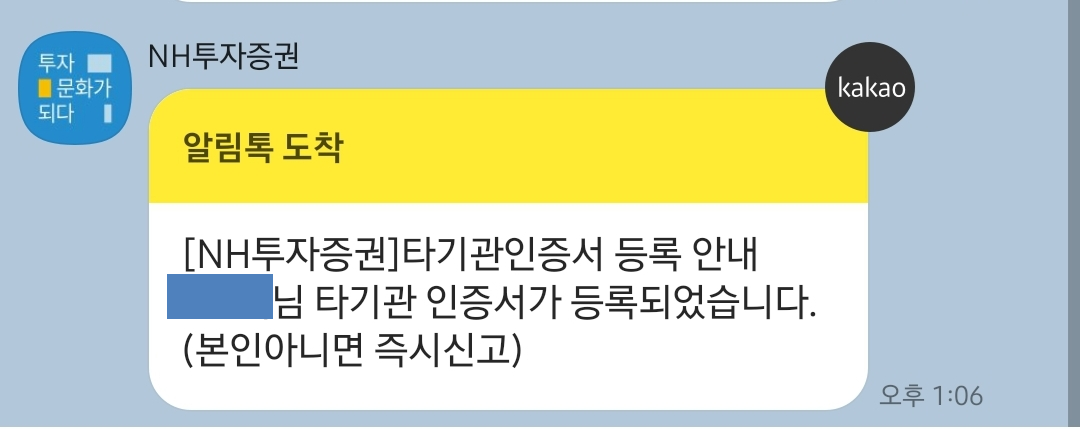 이렇게 진행을 하시면, 카카오톡으로도 NH투자증권에서 알림톡이 도착해서 타기관인증서 등록을 시작한다고 알려줍니다.