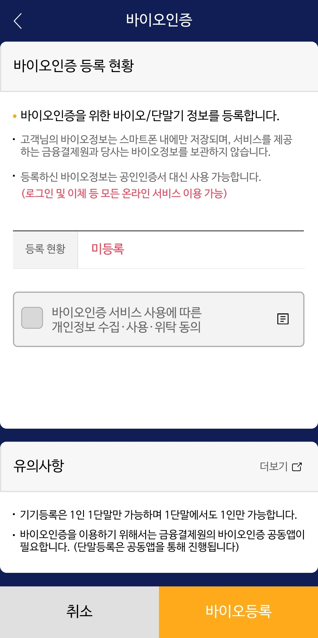 가면 위와같은 창이 나오고요. 유의사항을 읽으시고 개인정보 수집,사용,위탁에 동의를 하시면 되는데요. 기기등록의 경우 1인당 휴대폰 1단말기에만 가능하며 휴대폰 하나의 단말기에 1인만 가능하다고 합니다. 확인하셨으면 다음으로 넘어가시면 되고요.