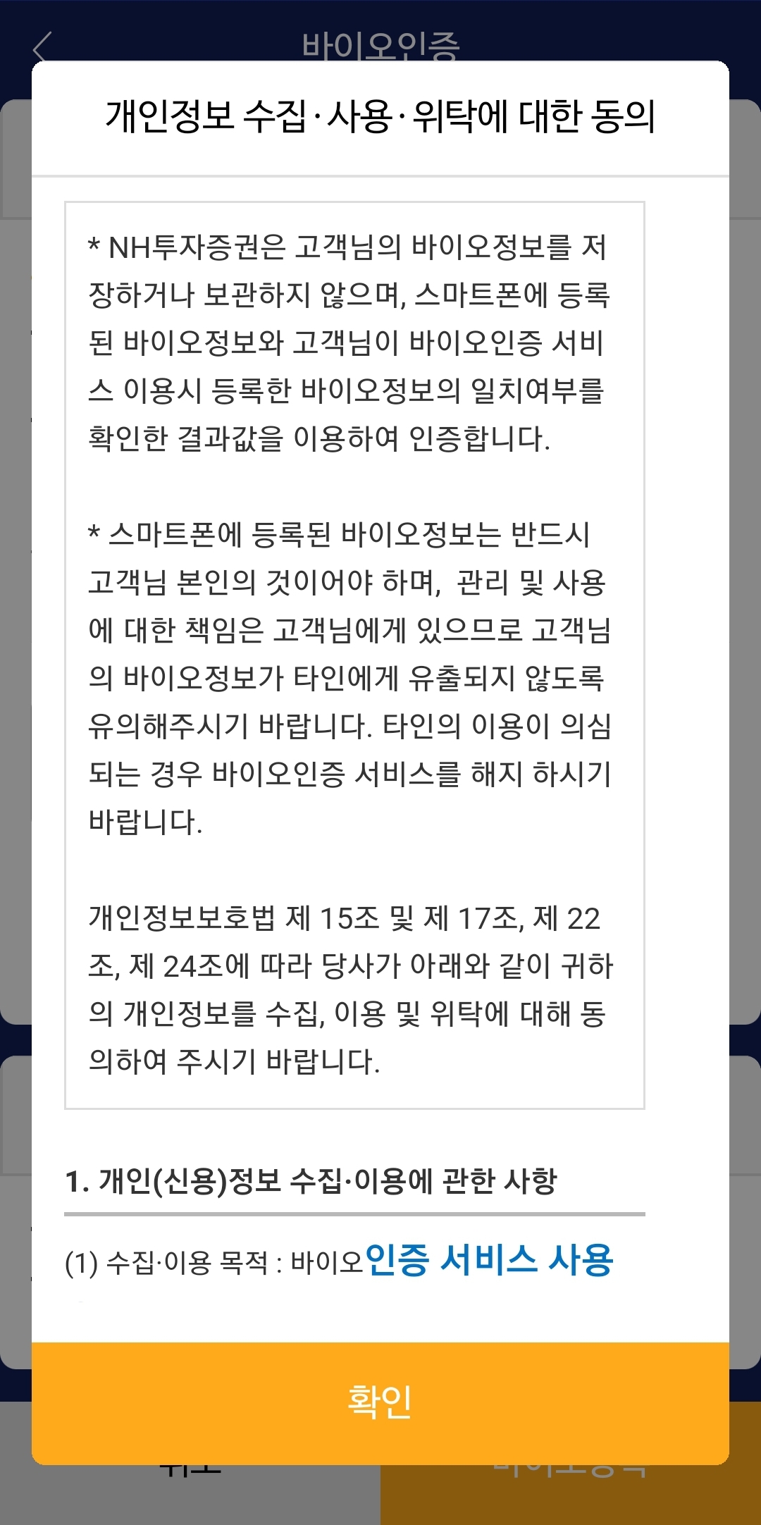 카카오톡에서 NH투자증권에서 바이오인증 등록을 시작한다고 등록안내 카톡이 옵니다. 보통은 등록완료된 경우에만 오는데 진행되는 절차에서도 오는 것은 좋은 서비스 같아 보입니다.