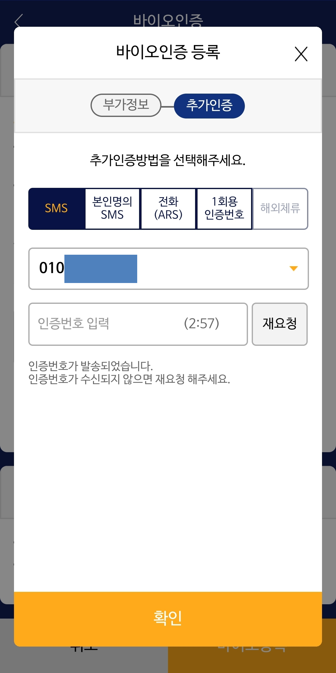 바이오인증 등록을 위해 부가정보를 확인하고 추가인증을 하게 되는데요. 휴대폰번호와 생년월일을 먼저 입력합니다. NH투자증권 QV의 바이오인증의 경우 꼭 본인의 휴대폰에만 가능한게 아니라 타인의 휴대폰에도 가능한 것으로 알고 있고요.