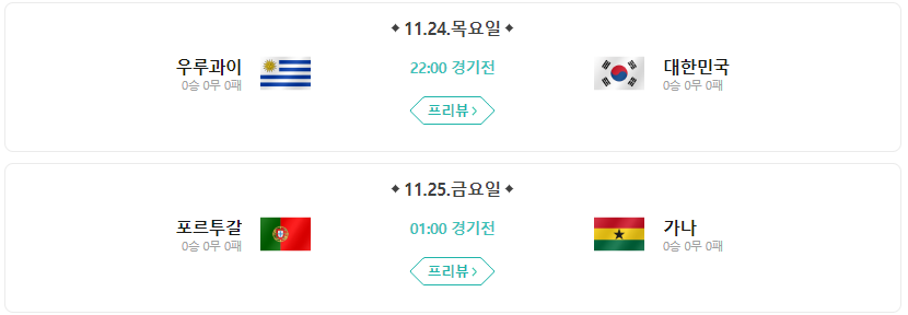 가나는 3시간 늦게 첫경기를 치룬만큼 두번째 경기는 대한민국에 비해서 3시간 덜 쉬고 출전한다고 보면 됩니다. 이어서 6시간 뒤인 29일 화요일 새벽 4시에는 포르투갈과 우루과이의 경기가 있는데요.