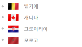 F조는 벨기에 캐나다, 크로아티아, 모로코인데요. 36년만에 월드컵 본선에 진출한 캐나다는 비교적 손쉬운 상대처럼 보이지만 벨기에와 크로아티아가 딱 버티고 있어서 모로코가 16강에 진출하기는 만만치 않아 보입니다.