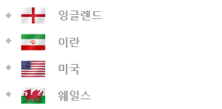 축구종가 잉글랜드, 이란, 미국, 웨일스로 되어있는데요. 64년만에 웨일즈가 월드컵 본선에 진출한게 매우 눈에 띕니다. 웨일즈도 피파랭킹 19위를 기록하고 있는데요.